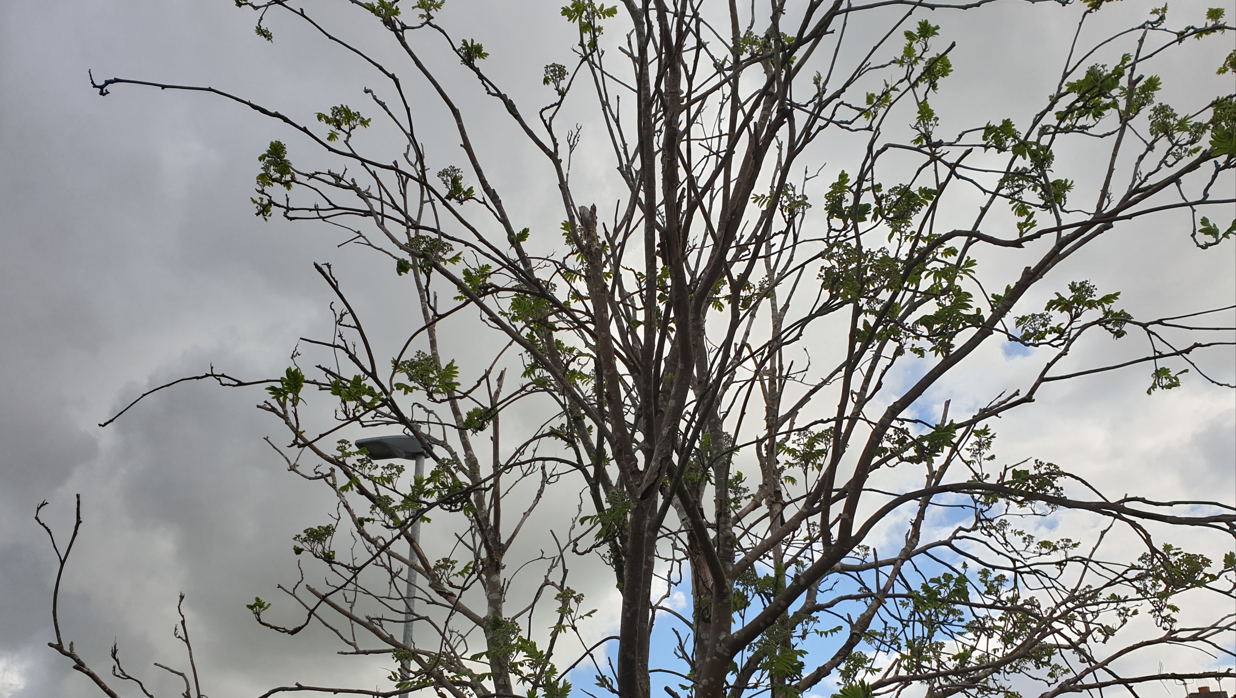 It hasn’t had the easiest of lives. Quite early on it was snapped, I think by a passing schoolboy. My mother in law strapped it up (the tree not the schoolboy) and it thrived for a while though never fully recovered. Now it is a shadow of its former self. Half of the branches are dead while the rest is just coming into leaf. It is a pale shadow of the other trees in the street.