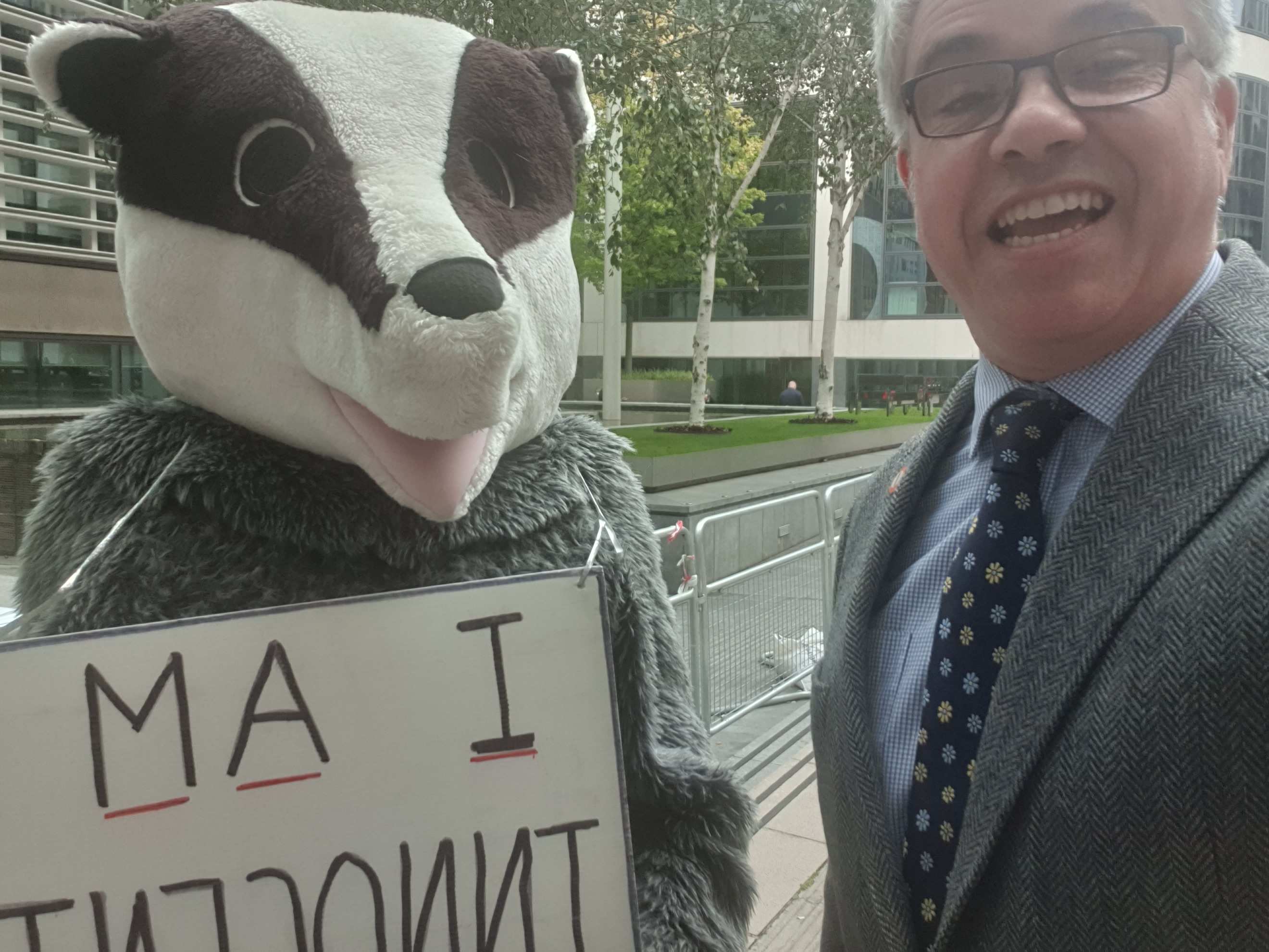 As I was coming out of the Home Office – wait, that sounds a lot grander than it actually was – there was someone dressed in a badger suit. Around their neck they had a sign which said I am innocent.