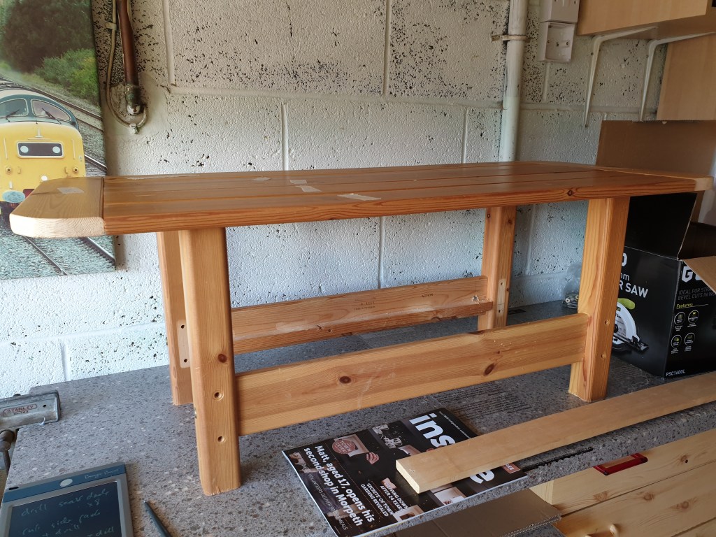 Now neither of us are carpenters yet we made the most of our enthusiasm. We drew out designs, changing them to fit the available wood and eventually settled on the final shape. We took turns to saw, drill, glue and screw until a coffee table appeared on the workbench before us. In the end it still had some finishing off to do but looked impressive with its slatted top, sturdy legs and magazine shelf below.