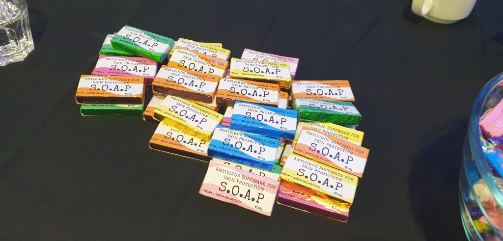 After lunch the exhibition started to pack away. Most businesses had brought freebies to give away. Pens, pads and sweets were the norm yet there were the odd things such as stress balls, cupcakes and our soap. As the close beckoned there was a general flurry of activity as it was clear that no one wanted to take their swag back to the office. Perhaps that is what they are measured on, how much stuff they managed to give away. The exhibition closed in a mad giveaway of merchandise.