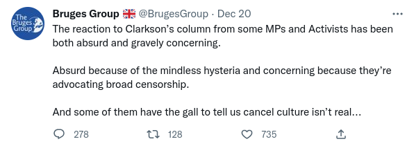 Calls have been made for Clarkson to lose his various jobs though I would be surprised if that happened. He still has a huge following who may well indeed agree with him. The conjoined spectres of free speech and cancel-culture have raised their heads again. The Bruges group, never one to hold back on its opinion, has come out with guns blazing. It claims that asking for Clarkson’s head is an attack on free speech.